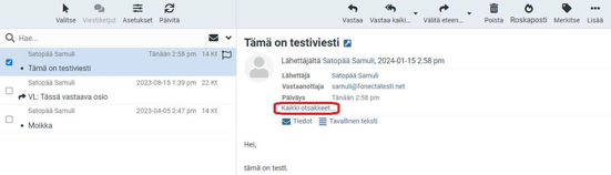 Vinkki: Jos tarvitset apua viestin viiveen tai lähetysketjun tulkitsemisessa, voit kopioida ylätunnisteen sisällön ja jakaa sen tekniselle tuelle tai asiakaspalvelulle.
