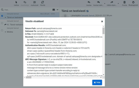 Olet nyt tarkastellut sähköpostin ylätunnisteita onnistuneesti.